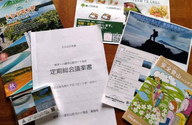 色んな資料が配られました。昨年途中から岩手山の噴火レベルが上がったことから当面登山禁止に。なので岩手山に頼らないガイドニューの構築やガイド間の連携強化などが協議されました