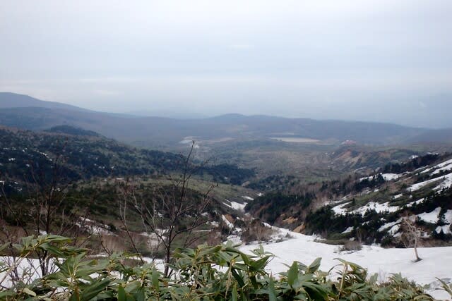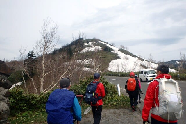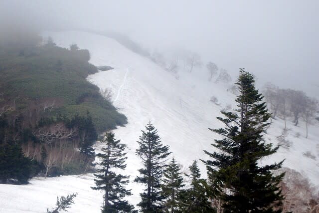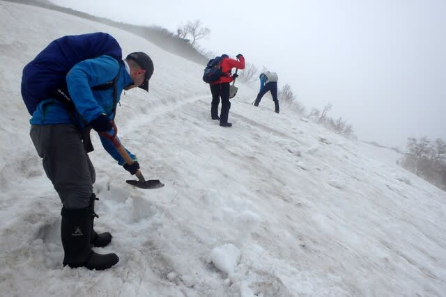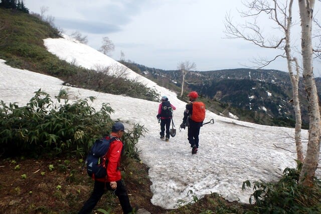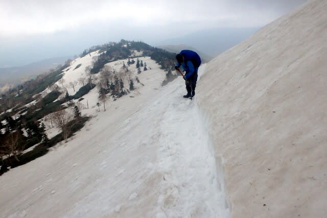 本日は自分の所属する岩手・八幡平山岳ガイド協会定期総会の日ですがその前にひと仕事。八幡平の一つのピーク茶臼岳への登山道はこの時期大きな雪渓が残り、滑落の危険性があることから毎年雪切りをしています。登山道の整備は慣れていますがこの作業は初めてなので、微力ながらお手伝いさせていただきました。人海戦術で作業は順調に進み雨の降る前に終了。アルプスの山などは雪渓をトラバースする場面が多くありますので、その整備の重要性と苦労を実感できました。