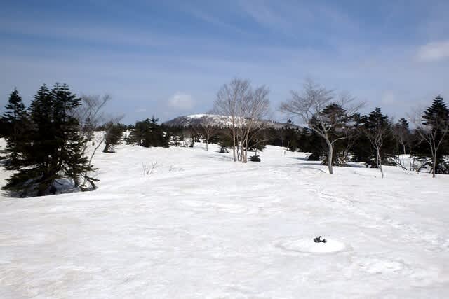 オオシラビソのある前衛峰の小白森山に到着!!ここは湿原や池塘もあるところだが当然雪の下。で、ここまで約2時間半。ちょっと休憩~