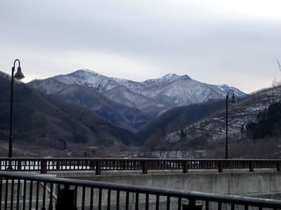 早池峰ダムから望む鶏頭山と毛無森。あの鋭い鶏頭山を越えて左ののっぺりした毛無森へ。思ったより雪が着いてない?