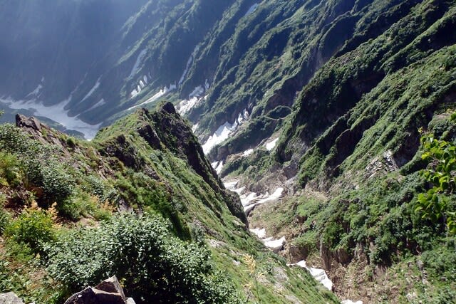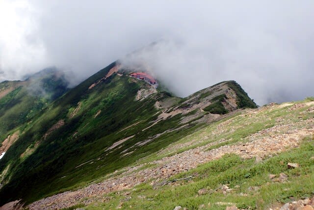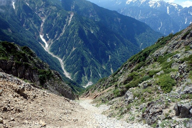 今日泊まる五竜山荘へ下る。しかしこの鹿島槍と五竜岳の間はさすが破線ルートだけあって荒れてるし困難な路だと思った。ホント気を抜ける隙がない!!