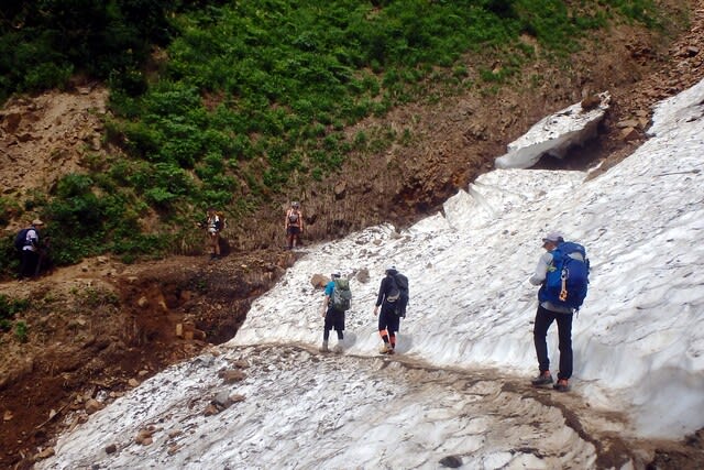 およそ8合目位の雪渓ポイント通過中。KZY氏は一度鹿島槍登ってるのでガイド役^^