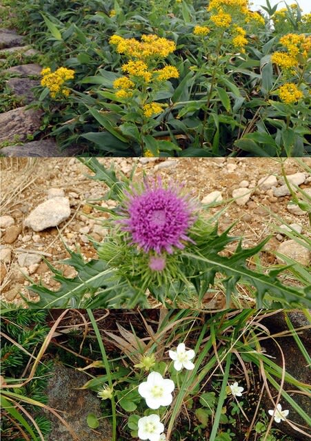 沿道を飾る秋の花々。ミヤマアキノキリンソウと鳥海アザミ、ウメバチソウ