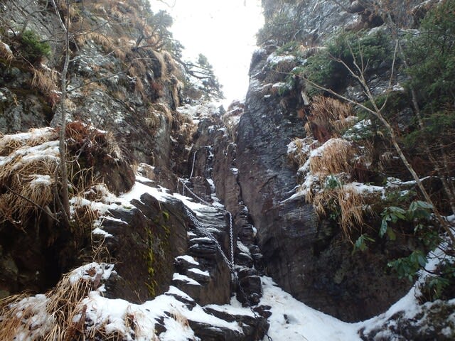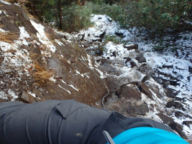 何回目かの鎖場。ここが一番恐かった。凍っている。掛ける足場も掴まる岩も殆ど氷。滑ったら遥か下までダイブだ