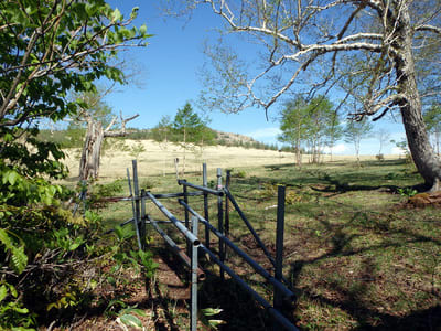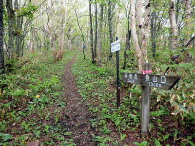 まずは奥の方から。遠別岳へ向う。放牧用の鉄柵をすり抜けて縦走路へ