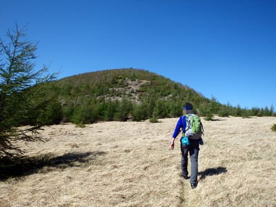 突然、このように風景が開けた。平庭高原一のビュースポットになっているそうだ。ここでランチしたい。でも目指すは正面にそびえる平庭岳
