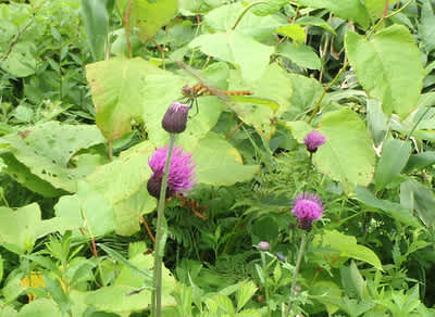 アザミとトンボ。トンボ沢山。しかしシオカラトンボは何処消えたのか?