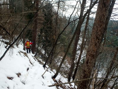 ピンクテープ付け直しながら進む。雪庇の下はこんな感じ。落ちても重篤にはならないが這って登るのが厄介な感じ