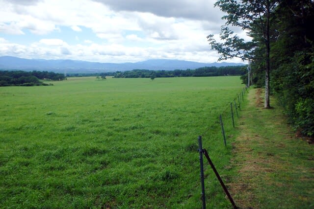 下りきると牧場に出る