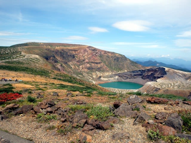 この御釜湖眺めながら馬の背を進む。極上のひと時。警戒レベルが上がった時はこれが白く濁ったということを仙台のご夫婦に教わる