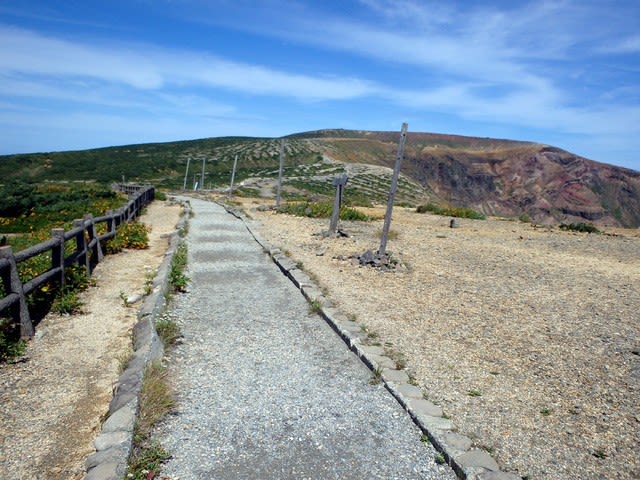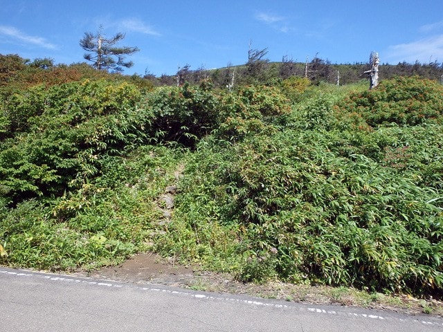エコーラインから更に有料のハイラインを上がればいきなり刈田岳山頂だが、やはり足で登りたいので、車が数台停まっている路側帯から出発。登山道が見える