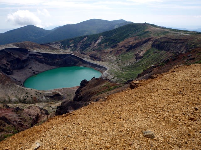 でた!これが今話題の御釜湖だ。綺麗な色してる。馬の背とその奥に熊野岳