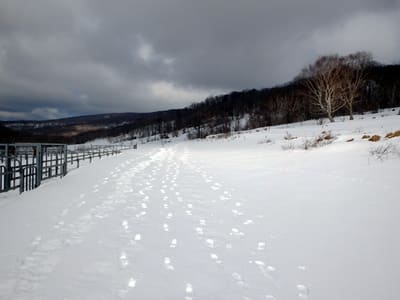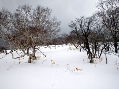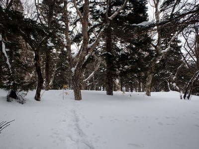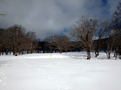 通行止ゲート脇(湿原入場可)から林道へ。先人の記録ではここをすぐ右斜面へ取り付く筈だが足跡は真っ直ぐ湿原方面へ。総勢5人の模様。スノーシューは数日前のものか?