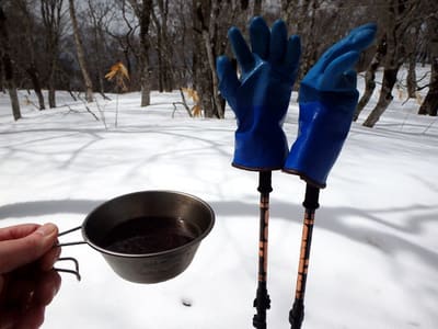 ちょっと休憩。さすがにスノーシューで10km以上歩いてると効くぜ