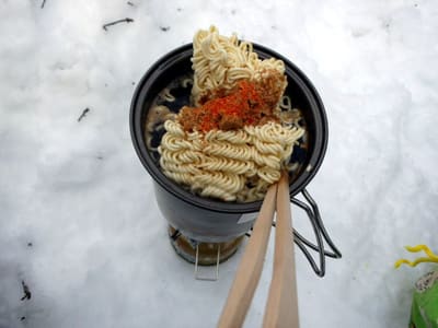 さて山飯を作ろうかと材料準備するも周りに結構人がいたのでパス。ウインナー入りラーメンで手を打つか