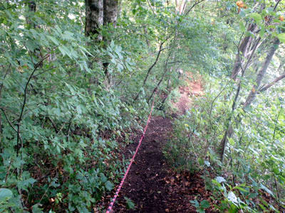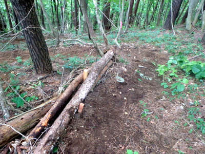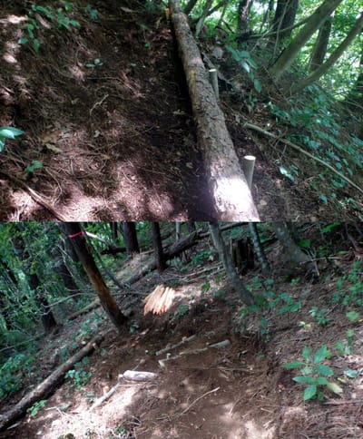 ざんげ坂。おお?先日拡張した九十九折れの路に沿い丸太が設置してある